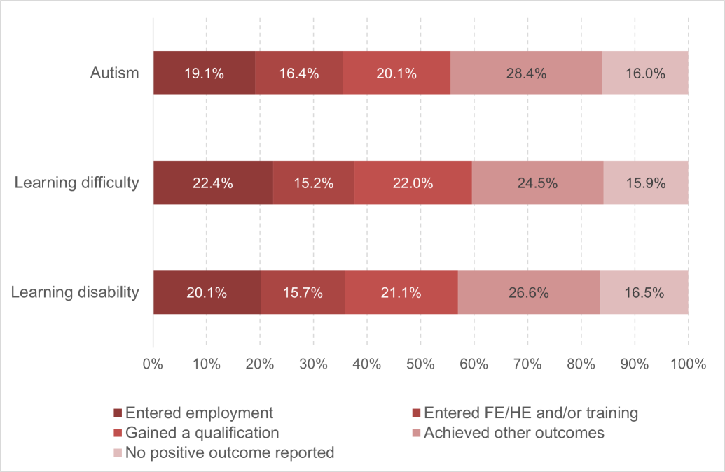 To date, 16,177 people with a learning disability, learning difficulty or autism have received employability support through NOLB since its inception in April 2019 (though this figure may double count individuals who have reported more than one condition). This includes 4,110 people with a learning disability, 6,570 with a learning difficulty, and 5,497 autistic people. To give an idea of scale, a total of 92,523 people have received employability support through NOLB. This means roughly 17% of all recipients of employability support through NOLB reported a learning disability, learning difficulty or autism (again, this may double count those with multiple conditions – the individual stats for each condition are 4%, 7% and 6% of total recipients respectively).